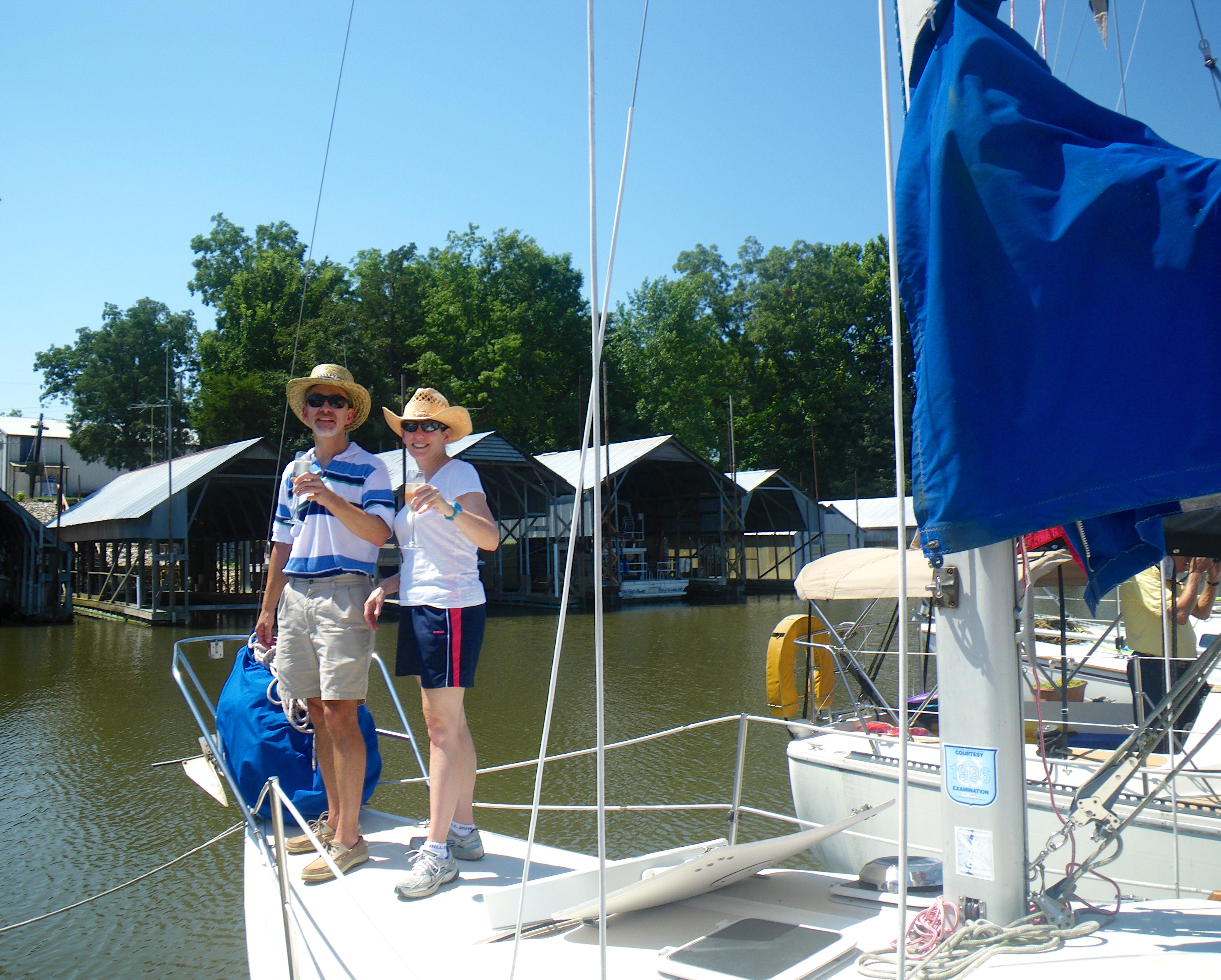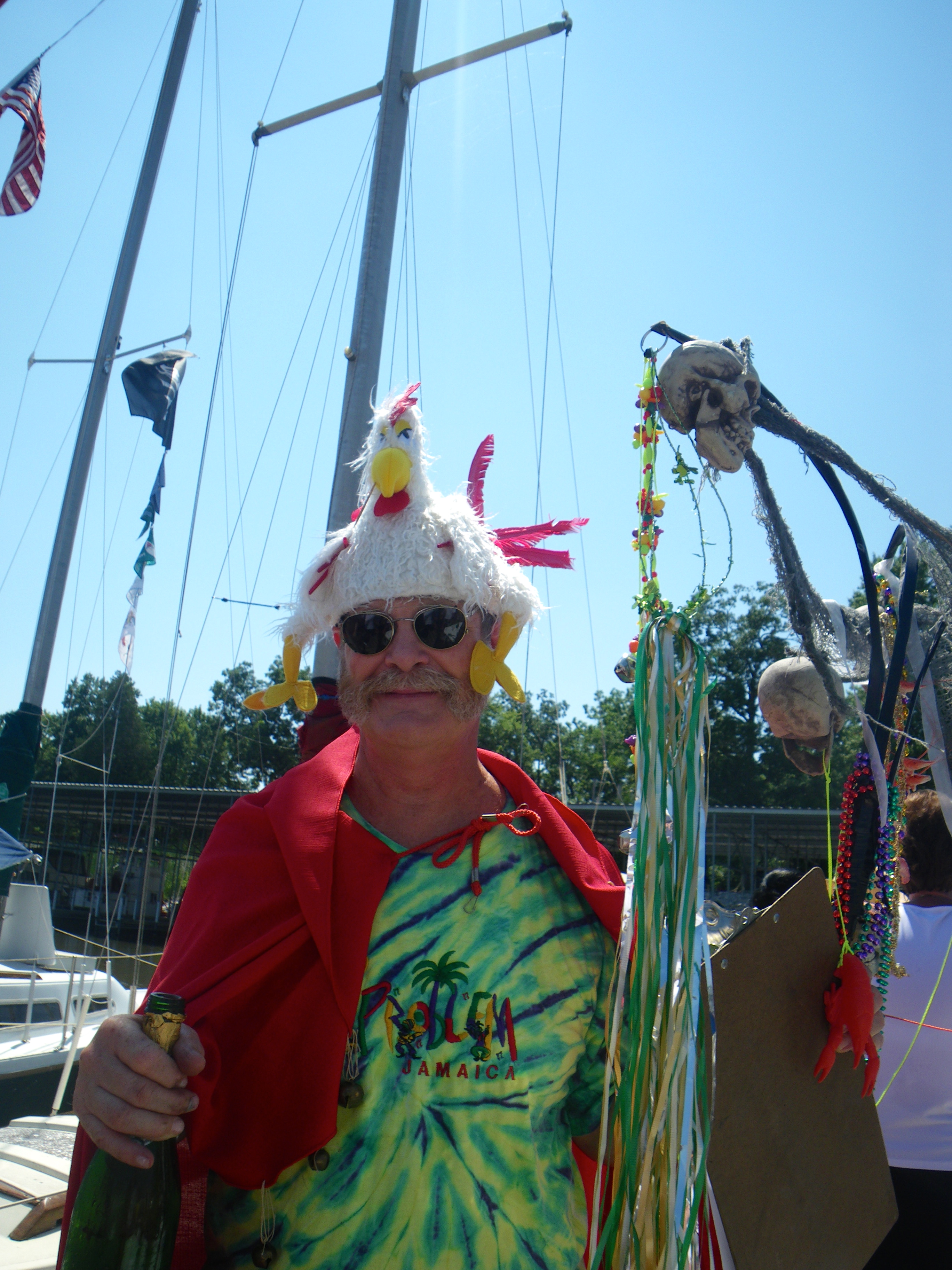 Yesterday we welcomed new sailors to our dock and took part in the de-naming and christening of their recently purchased older boat. The ceremonies involved a chieftain, a sailor’s ritual, many libations offered to Neptune and rulers of the four winds, and a general celebration of fresh members in the Sioux Harbor tribe.