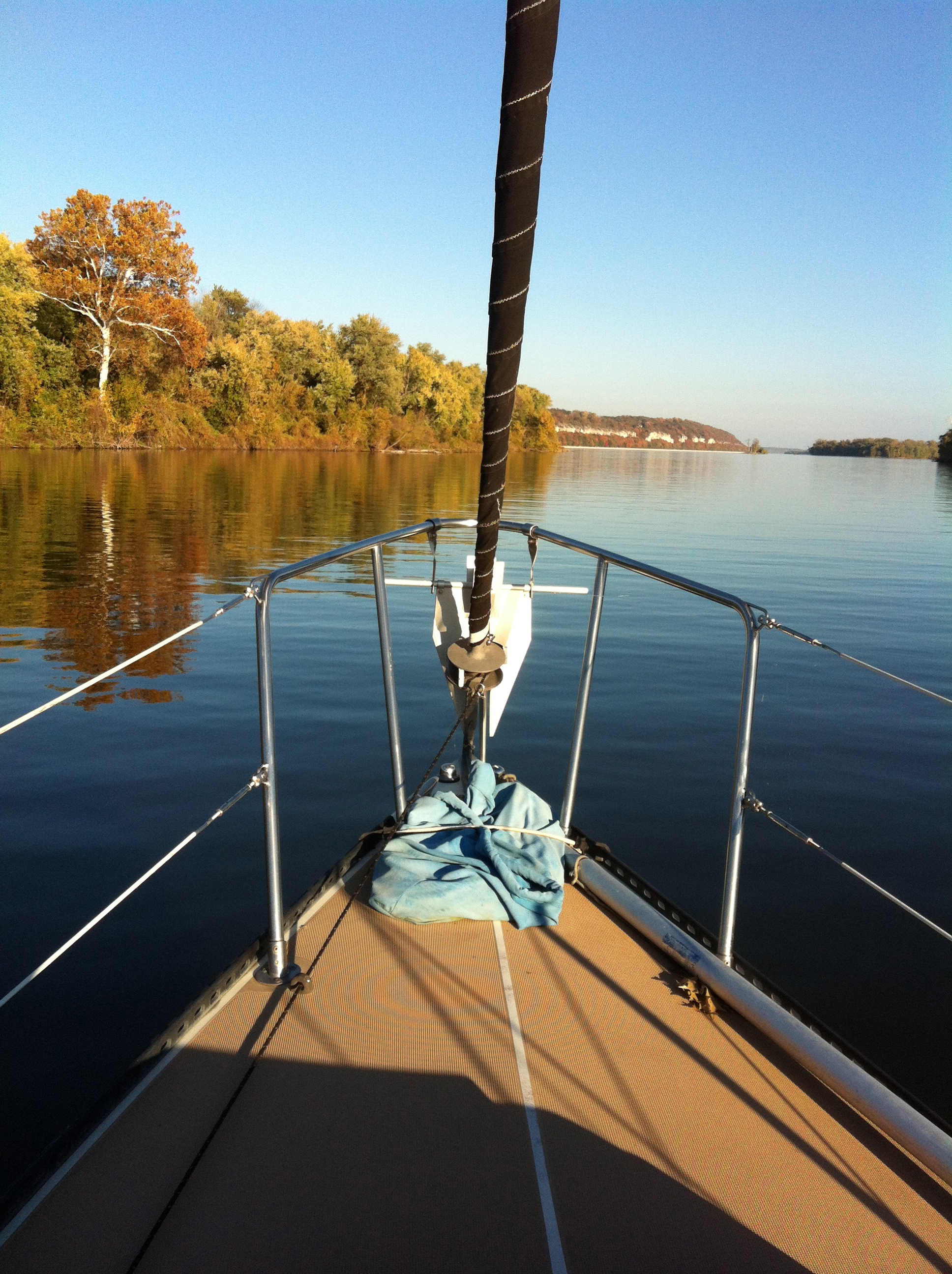 The Red Sox wore red caps and helmets for Saturday’s Game Three of the World Series. Sunday they switched to blue. Most Midwesterners have switched the AC off and the heat on. All of the harbor masters along the Alton Pool have warned their members that the water and pump out facilities will be switched off within the week as temperatures are bound to fall below freezing at night. The sun that recently glared mercilessly to further overheat the hemisphere now rides the horizon at hip-height, its rays lazily grazing the cooling waterways. It sleeps late and retires early allowing the supercilious river waters to brusquely deflect its tepid brassy rays. Red to blue, warm to chill, on again, off again. Must be the season of the switch.