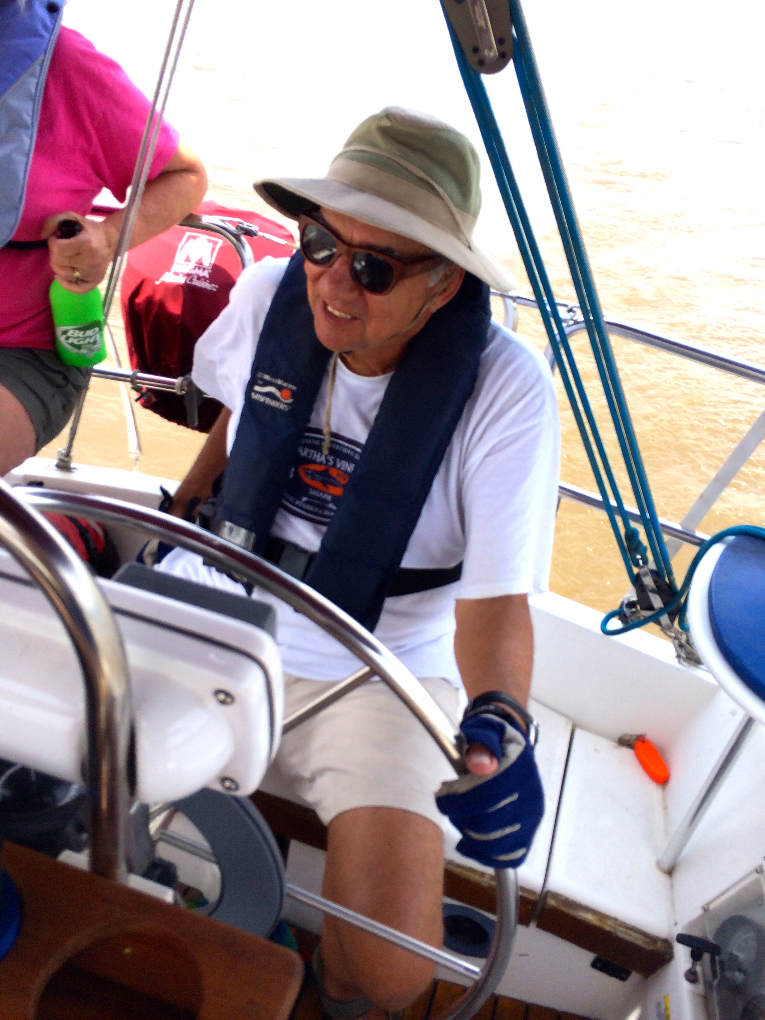 Moments later the wind shifted and the sky darkened. I ordered the crew to furl the jib and then commanded that the mainsail be dropped – fast. We’d completely missed the thunderhead hidden by an island in the channel. The boat was suddenly broadsided with 28 mph gusts. The sails thundered as we pointed into the wind. George and Ralph climbed up to the mast, pulled down the sail and secured it – all the while the wind was howling and spray was hosing down the deck. The boat bucked through confused waves as the wind fought the current. It took all of my strength to hold a course into the wind and keep the guys steady as they wrangled the sail onto the boom. Going down with the ship was not mentioned in my daily horoscope, we stayed calm, followed our training, and were glad we’d ignored the friendly jesting of another sailor that all can’t be well if the captain leaves the harbor wearing a life jacket. We all had ours on when the weather went to hades in a nano-second. Between subsequent squalls we motored into the harbor, docked safely and sat in the rain under the bimini toasting our confidence and competence during the storm.