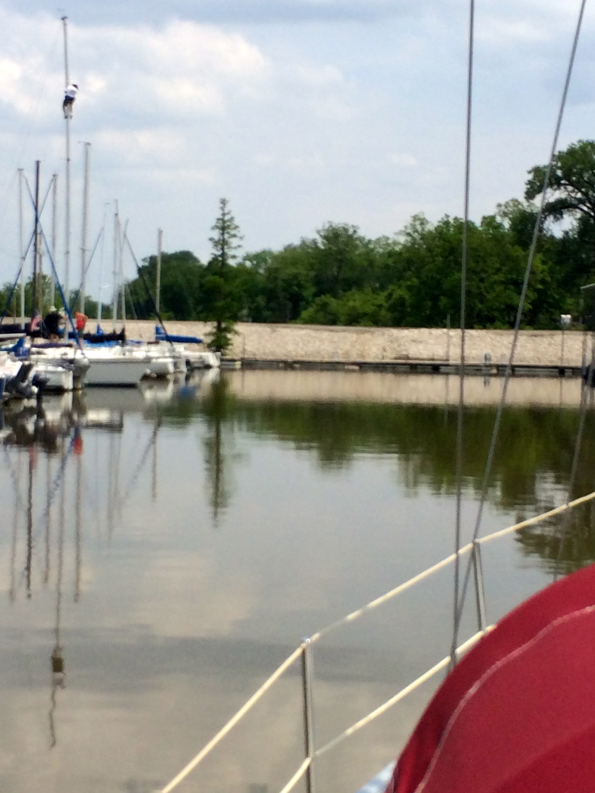 We picked up friends in the harbor. Ralph had obligingly been hoisted 52′ up a newcomer’s mast to help fix a broken halyard. We waited until he was safe on deck and then headed back out around two o’clock. We were sailing up the channel dodging barge traffic and scouting for snakes when Ralph asked about the time and the weather. I’d been watching the western sky and agreed that the emerging storm line was early, but the dark clouds were building to the northwest and would probably miss us. When we sighted rain upstream I made the decision to tack and head down river to dodge the storm. George asked if he should take the sails down. I declined and reiterated that we were putting the bad weather a’stern. He shrugged, obeyed the captain and grumbled, “The issue is putting all of this down – it’s a lot of work.”