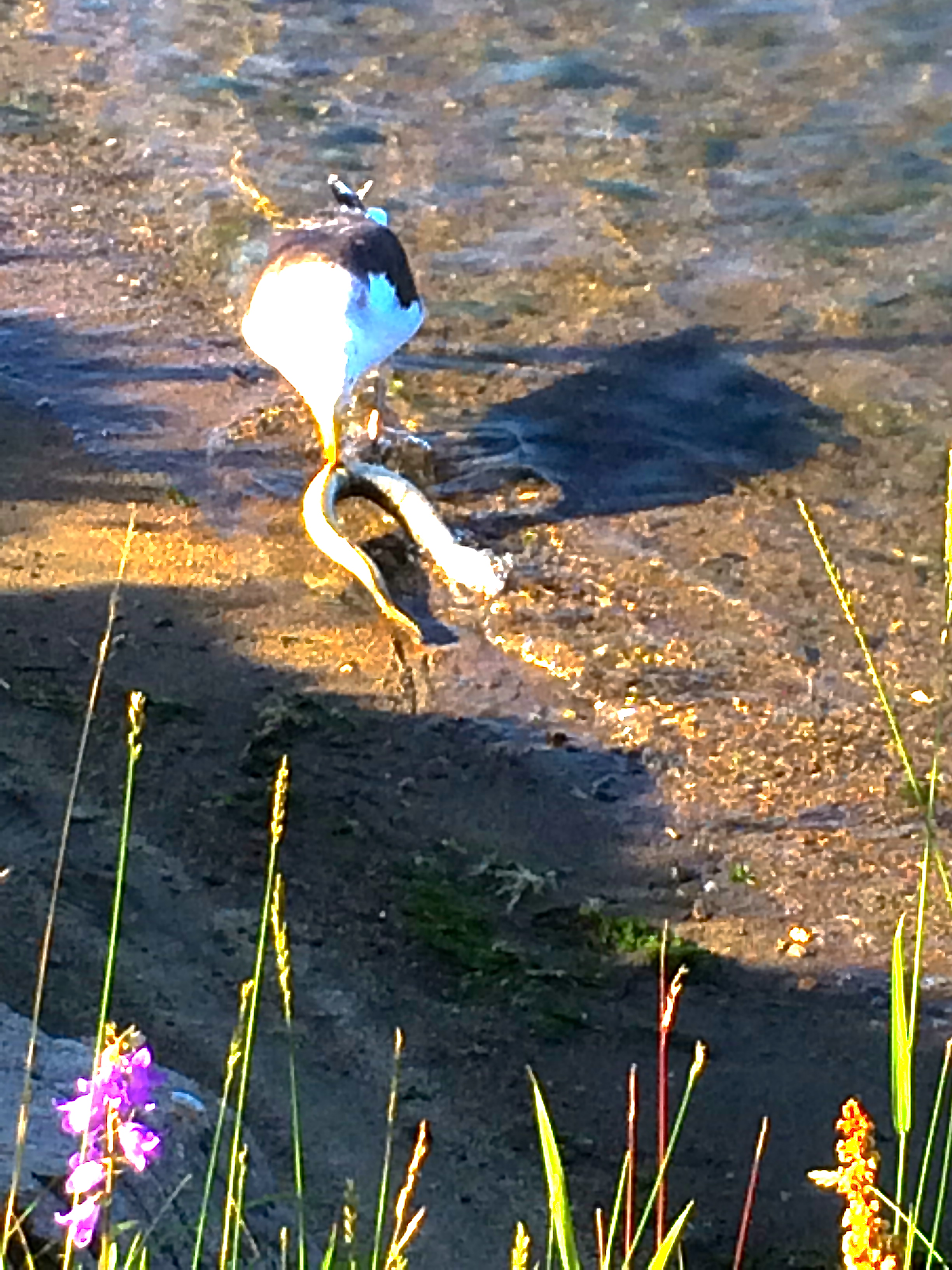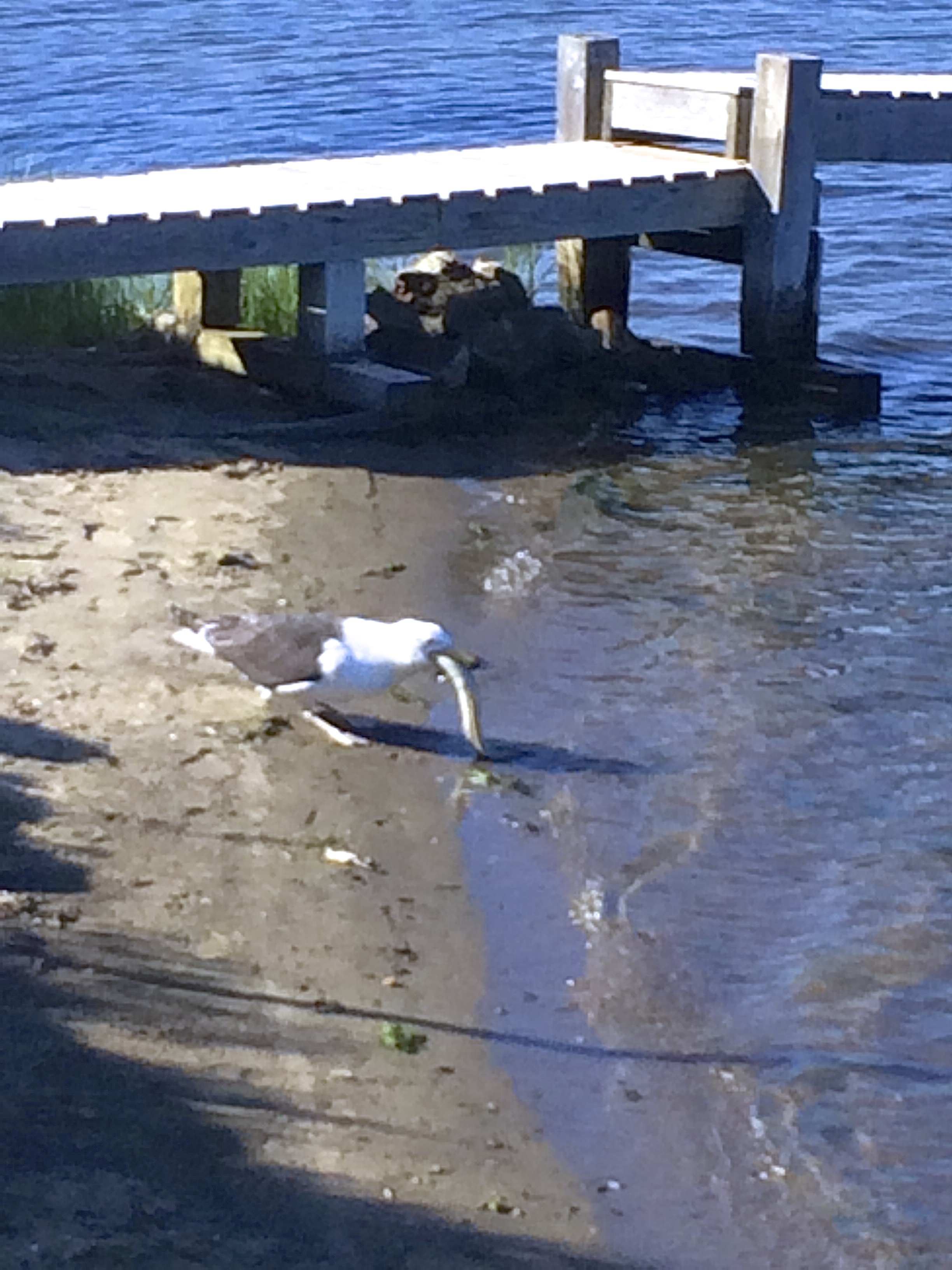 Sea gulls are predators too. Last weekend a large gull dove into the river and snagged a two foot long eel. We gagged as it pulled a deep throat maneuver and swallowed it from head to almost the tippy tail – only to repeatedly throw it up, attempt to filet it to a reasonable bite size, and gulp it down again. Both the eel and the gull appeared stressed. Half an hour later the gull with the eel visible beneath its neck, staggered off the dock with a sagging belly and haltingly flew to the marsh to digest.